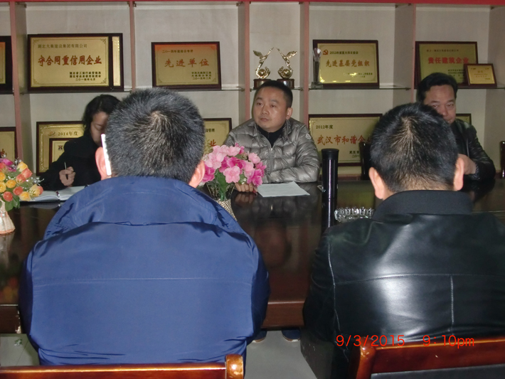 董事長徐濤最后提要求,徐董要求公司每一個(gè)崗位員工都能發(fā)揮應(yīng)有的作用,人人都當(dāng)實(shí)干家,當(dāng)天工作不過夜,當(dāng)月工作提前抓,狠抓落實(shí)過程,確保目標(biāo)落地。2015年公司的總目標(biāo)是要超越2014年,在公司推行新的薪酬和績效管理制度,確保各施工項(xiàng)目安全、質(zhì)量和進(jìn)度,努力爭創(chuàng)質(zhì)量和安全黃鶴杯各二次;建設(shè)一支紀(jì)律嚴(yán)明,能接業(yè)務(wù)、能打勝仗的項(xiàng)目經(jīng)理隊(duì)伍,努力培育公司參入市場競爭的能力,使公司業(yè)績、員工收入同步增長。徐董并對公司各部門2015年的工作作了具體安排。