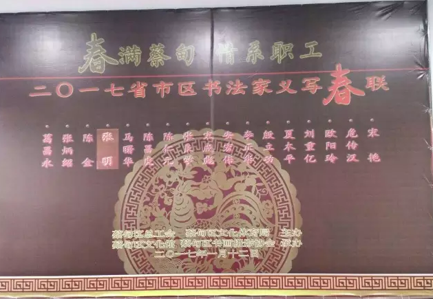 元月12日上午,在雞年新春即將來臨之際,蔡甸區(qū)總工會組織省市區(qū)書法協(xié)會書法家在區(qū)總工會工人活動中心開展《春滿蔡甸·情系職工》2017省市區(qū)書法家義寫春聯(lián)、送祝?;顒?。區(qū)總工會、文體局相關領導、省市區(qū)著名書法家張良學、陳昌虎、宋成彪等出席了此次活動,集團公司人事行政部吳志勇、周仟應邀參加了該活動。
