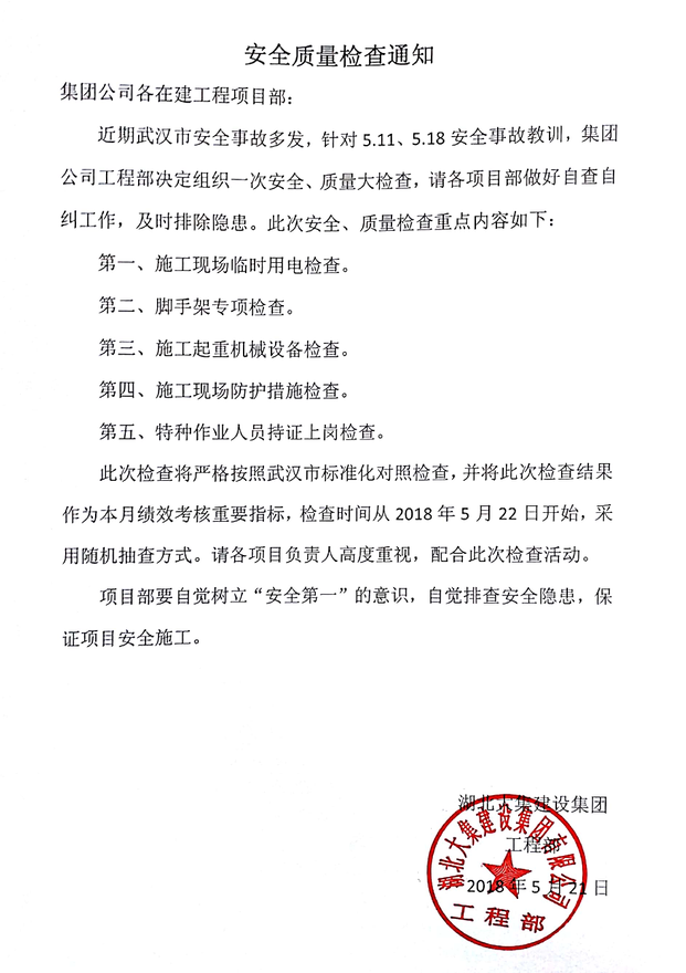 為進一步貫徹落實集團公司“安全生產(chǎn)重于泰山”的管理理念,5月21日,工程部下發(fā)質(zhì)量安全檢查通知,并成立質(zhì)量安全檢查組,自5月22日起隨機對集團在建項目施工現(xiàn)場進行安全檢查,嚴密排查施工現(xiàn)場的安全隱患,確保各項目安全施工工作順利開展。