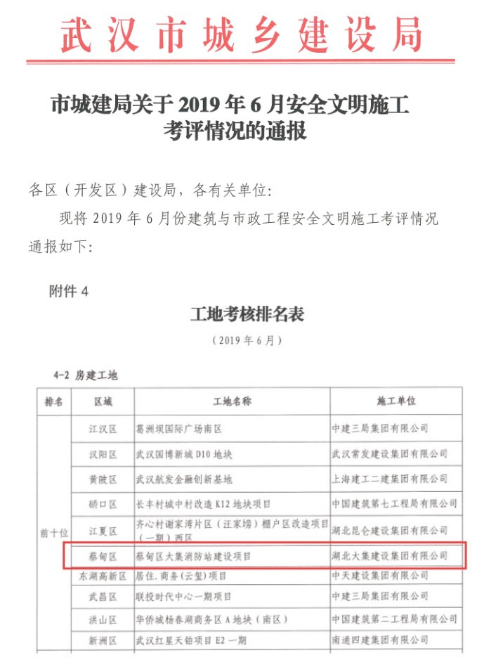 近日,武漢市城鄉(xiāng)建設(shè)局對(duì)2019年6月安全文明施工考評(píng)情況進(jìn)行通報(bào)。在全市被抽查的372個(gè)房建工地中,由湖北大集建設(shè)集團(tuán)承建的大集消防站工程表現(xiàn)突出,得分排名第六位,并受到蔡甸區(qū)建管站的表?yè)P(yáng)與好評(píng)。