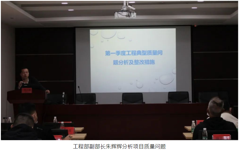 隨后,會議進入質(zhì)量、安全隱患分析環(huán)節(jié),工程部副部長朱輝輝及安全主管秦春波采用PPT通報問題的方式,照片配合講述,更直觀的把項目質(zhì)量、安全隱患問題展現(xiàn)在大家面前,朱工和秦工結(jié)合項目現(xiàn)場存在的質(zhì)量、安全問題,著重分析了問題產(chǎn)生的原因以及現(xiàn)場的安全管理情況,并逐一對各項目提出了相應(yīng)的整改措施。