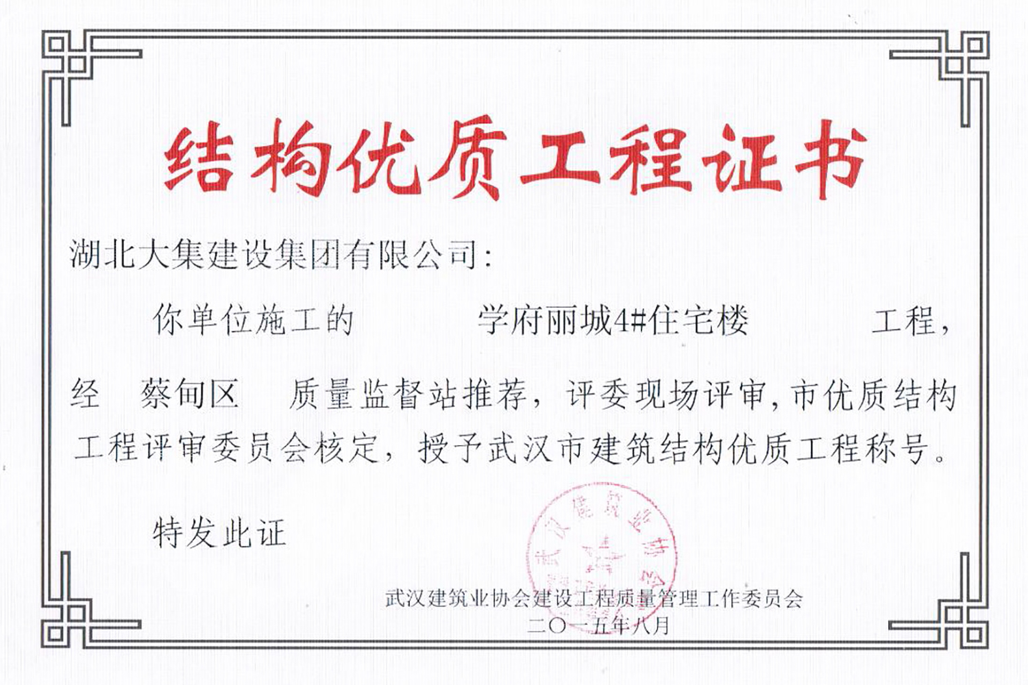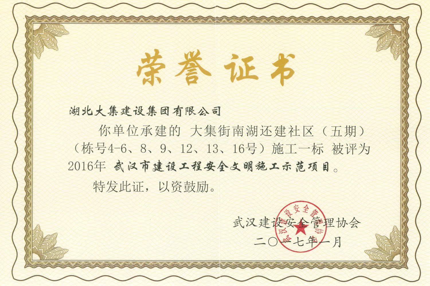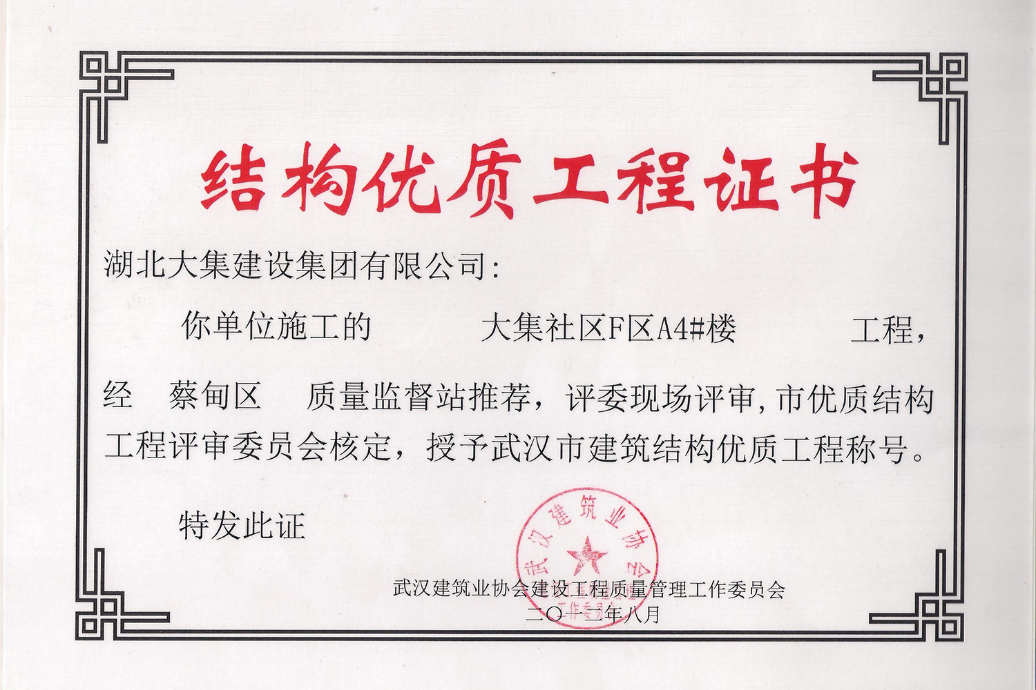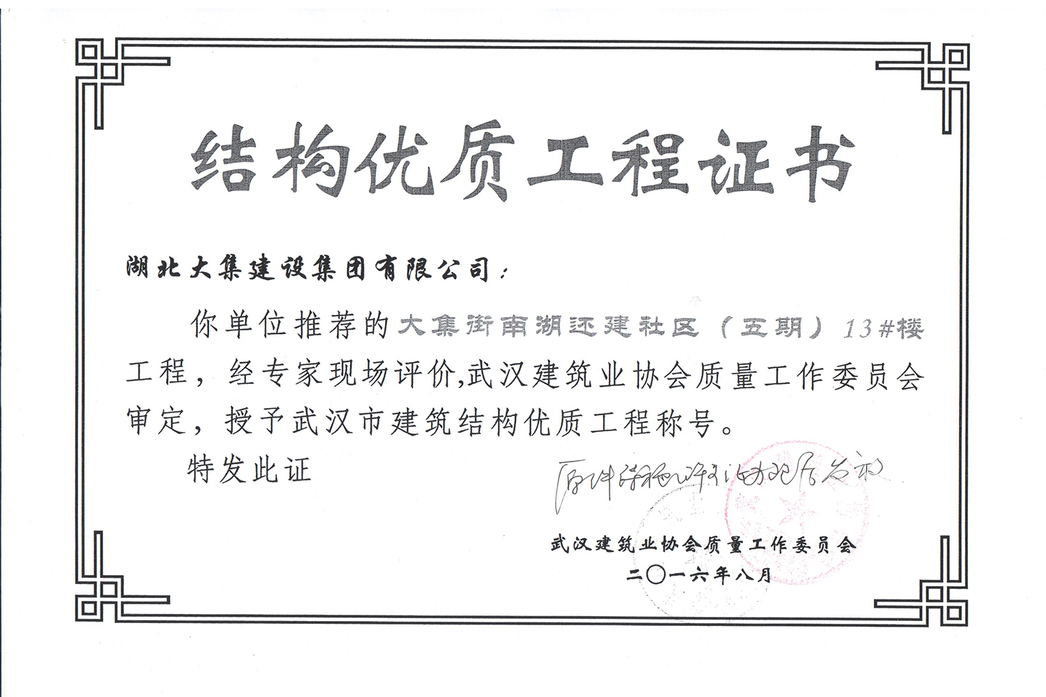 集團(tuán)秉持“安全是紅線,質(zhì)量是品牌,文明施工是形象”的企業(yè)宗旨,不斷加強(qiáng)全面管理,注重提高自身素質(zhì),以完美的履約、優(yōu)良的質(zhì)量、滿意的服務(wù),贏得了信譽(yù)。近年來(lái),湖北大集建設(shè)集團(tuán)先后與中石化集團(tuán)、中鐵上海工程局、中建八局、中鐵十二局、碧桂園集團(tuán)、世茂集團(tuán)、綠地集團(tuán)等央企、國(guó)企、地方標(biāo)志性建設(shè)單位合作,先后承建了“碧桂園知音豪庭”項(xiàng)目、“碧桂園光谷云境”項(xiàng)目、“大集G區(qū)蓮溪花園”項(xiàng)目等多個(gè)高層住宅小區(qū);承建了世茂龍灣46#、47#、48#地塊、花博匯桃李春風(fēng)二期等多個(gè)精品高端別墅群項(xiàng)目;承建了“南湖中學(xué)”、“南湖小學(xué)”、“南湖幼兒園”、“博奧幼兒園”等多個(gè)教育配套項(xiàng)目;承建了“孝感英眾超算終端科技產(chǎn)業(yè)園”、“鴻盛華全球航空服務(wù)產(chǎn)業(yè)園”、“盟盛汽車產(chǎn)業(yè)園”、“中原印務(wù)晶毅”等多個(gè)具有特殊設(shè)備安裝需求的鋼、混結(jié)構(gòu)工業(yè)廠房項(xiàng)目;承建了“常福商務(wù)廣場(chǎng)”等大型商業(yè)綜合體;承建了后官湖綠道二期、三期,常貴路西延伸段、黃星大道等多條大型道路市政項(xiàng)目;自主開發(fā)了“聚盛晶尚”住宅項(xiàng)目,改善人居環(huán)境,引領(lǐng)綠色棲居新領(lǐng)域;所有工程嚴(yán)格執(zhí)行施工作業(yè)全過(guò)程質(zhì)量、安全管理,多個(gè)項(xiàng)目被省、市級(jí)監(jiān)管單位授予“省結(jié)構(gòu)優(yōu)質(zhì)”、“省安全文明施工現(xiàn)場(chǎng)”、“市結(jié)構(gòu)優(yōu)質(zhì)”、“市安全文明施工示范項(xiàng)目”、“樣板工地”等榮譽(yù)稱號(hào)。