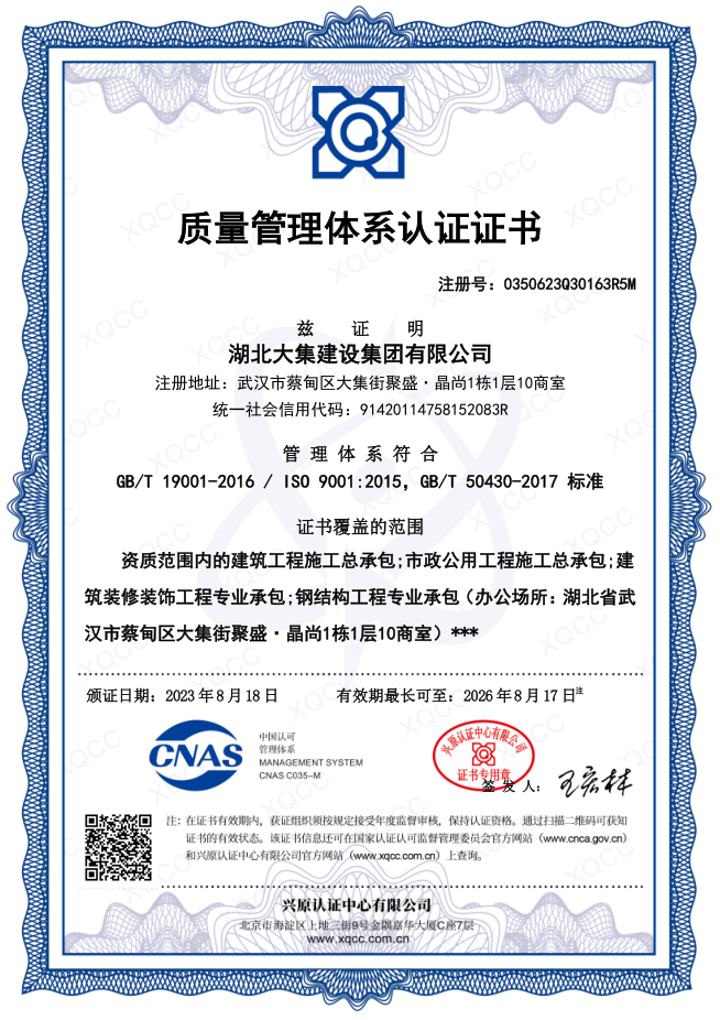湖北大集建設(shè)集團(tuán)有限公司成立于1990年,注冊(cè)資本10500萬(wàn)元,是武漢市蔡甸區(qū)本土建筑行業(yè)的龍頭企業(yè),在行業(yè)內(nèi)具有一定的品牌影響力。擁有建筑工程施工總承包一級(jí)、市政公用工程施工總承包一級(jí)、橋梁工程專業(yè)承包一級(jí)、隧道工程專業(yè)承包一級(jí)、輸變電工程專業(yè)承包一級(jí)、鋼結(jié)構(gòu)工程專業(yè)承包一級(jí)、地基基礎(chǔ)工程專業(yè)承包一級(jí)、電子與智能化工程專業(yè)承包一級(jí)、建筑裝修裝飾工程專業(yè)承包一級(jí)等多項(xiàng)資質(zhì)?,F(xiàn)已形成“建筑施工、園林綠化、文化旅游、房地產(chǎn)開發(fā)與物業(yè)管理”四大產(chǎn)業(yè)格局,并通過(guò)了行業(yè)和國(guó)家質(zhì)量管理體系、環(huán)境管理體系和職業(yè)健康安全管理體系認(rèn)證,三大安全管理體系日臻完善,是一家綜合力較強(qiáng)的綜合性建筑施工企業(yè)。