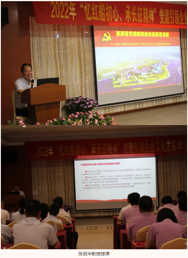 接著,湖北省委講師團(tuán)基層理論宣講員張啟華教授以“高質(zhì)量黨建推動企業(yè)高質(zhì)量發(fā)展”為主題進(jìn)行授課。張教授從“苦難與輝煌”、“消失與崛起”、“巨變與挑戰(zhàn)”、“經(jīng)驗與啟示”、“輝煌與蝶變”五個方面分別講述了中國共產(chǎn)黨的百年奮斗史、跌宕起伏中國房企十年之變、房企掌舵者眼中的2022年、紐約灣區(qū)發(fā)展成為世界級灣區(qū)的原因以及高科技贏在新時代的內(nèi)容,并在講解中融入了湖北大集建設(shè)集團(tuán)和武漢閱景匯兩家公司的發(fā)展歷程,讓大家對中國共產(chǎn)黨的發(fā)展、公司的發(fā)展以及個人的發(fā)展有了更加清晰的認(rèn)識以及深刻的反思。