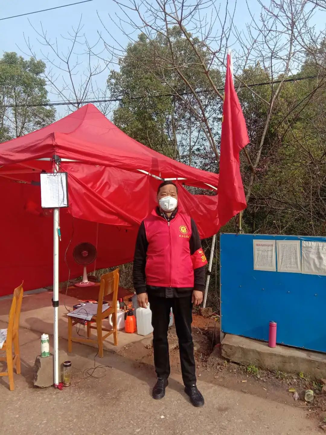 一個(gè)紅馬甲,一個(gè)紅袖章,一個(gè)口罩,57歲的集團(tuán)公司副總經(jīng)理徐家富作為志愿者已經(jīng)在這個(gè)平凡的小卡點(diǎn)堅(jiān)持了許多天。在這里,他也與武漢市數(shù)萬名志愿者一樣,做著平凡但重要的工作,檢查進(jìn)出人員、車輛的通行手續(xù),測(cè)量體溫,配合村里分發(fā)搬運(yùn)物資,為百姓搭建起安全的防護(hù)通道和物資運(yùn)送通道。簡(jiǎn)陋的卡點(diǎn)帳篷里除了消毒防護(hù)用品外,取暖的器材只有一個(gè)電烤扇,而武漢的氣溫僅在這一周,上下跳躍的平均溫差就超過十幾度,而這一切距離他剛剛做過的膽部大型手術(shù)僅僅過去了半年。